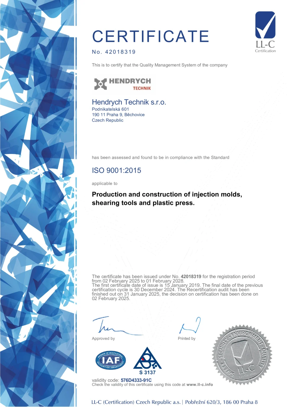 我们所有的生产流程已于2004年通过EN ISO捷克技术标准9001:2016